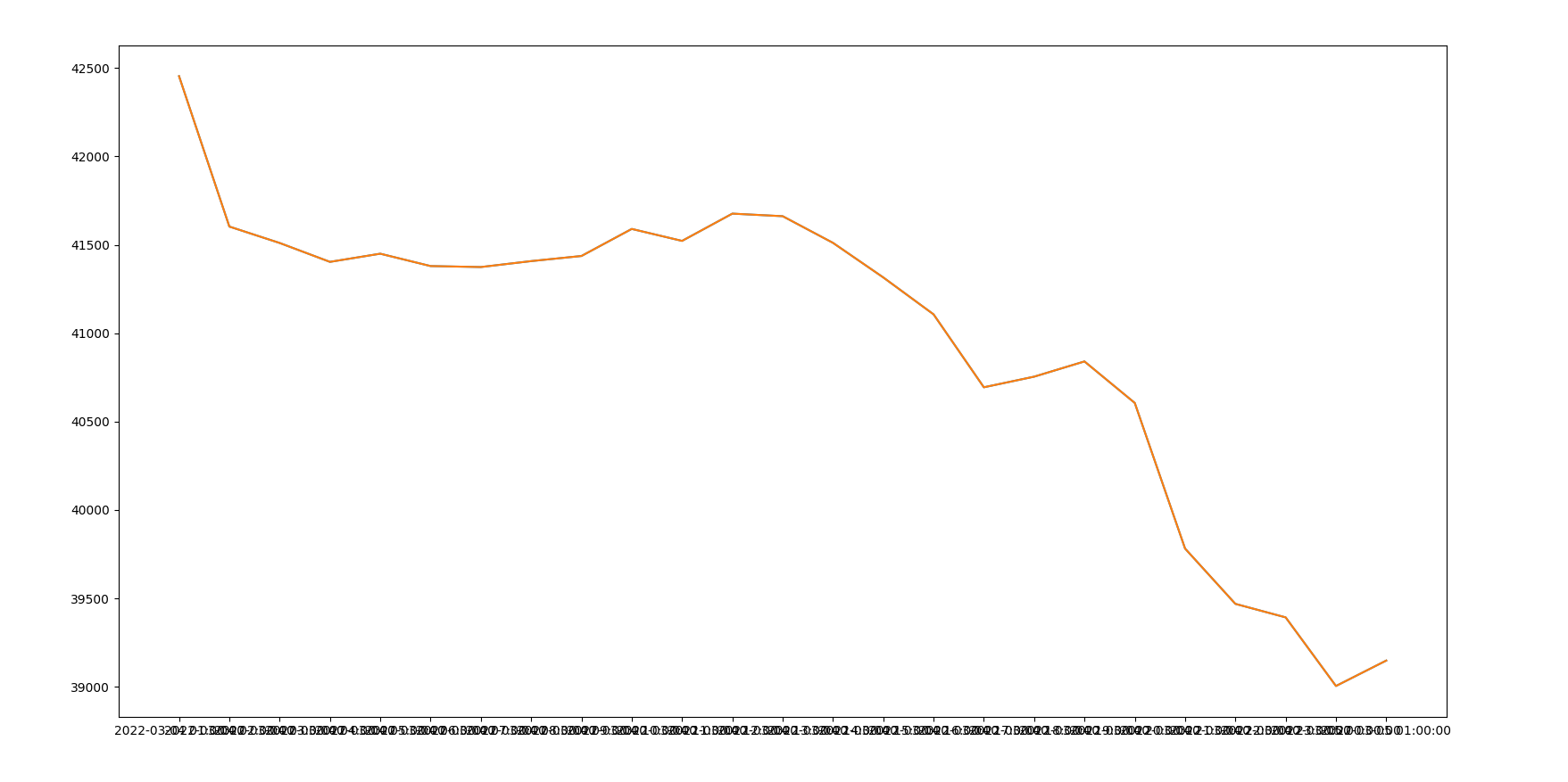 y = [42454.,41603.36,41510.58,41403.7 ,41449.93,41379.99,41374.45,41407.98,