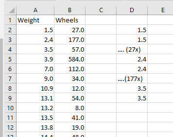 I want to take the first column (weight) and add it to a new column based on the amount next to it (wheels). So the column will have 1.5 27x, than immediatly after will have 2.4 177x and repeate this for all values shown. Does anyone know a simple way to do this?