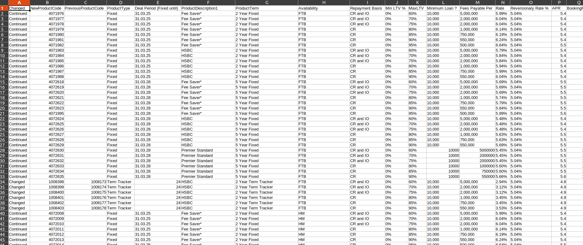 | Changed | NewProductCode | PreviousProductCode | ProductType | Deal Period (Fixed until) | ProductDescription1 | ProductTerm | Availability | Repayment Basis | Min LTV % | MaxLTV | Minimum Loan ? | Fees Payable Per | Rate | Reversionary Rate % | APR | BookingFee | Cashback | CashbackValue | ERC – Payable | Unlimited lump sum payments Premitted (without fees) | Unlimited overpayment permitted (without fees) | Overpayments | ERC | Portable | Completionfee | Free Legals for Remortgage | FreeStandardValuation | Loading |