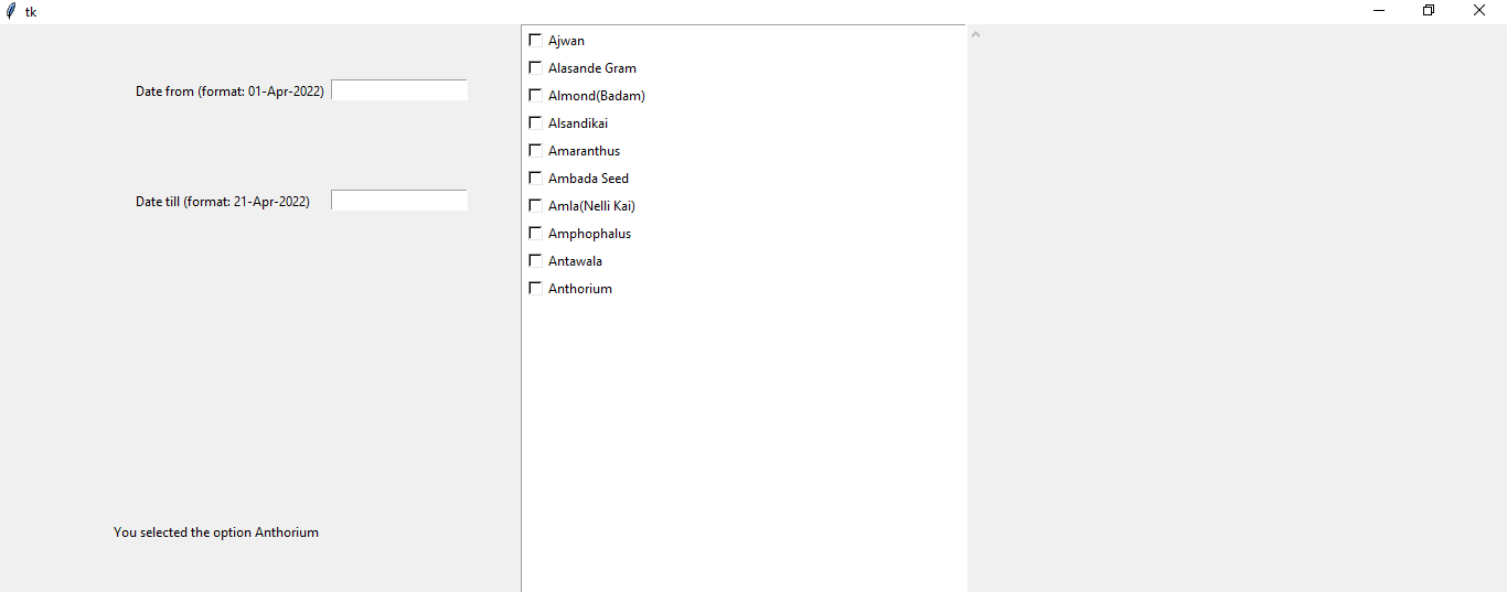 I created a GUI with 2 input boxes and a list of checkbuttons (derived from list ‘a’) with scroll. Now, I want to display all the checkbuttons which have been selected.