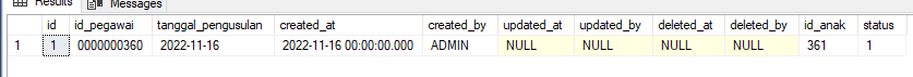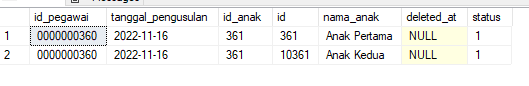 My Query: SELECT fpa.id_pegawai, fpa.tanggal_pengusulan, fpa.id_anak, pda.id, pda.nama_anak, fpa.deleted_at, fpa.status FROM form_pertambahan_anak fpa INNER JOIN peg_dtl_anak pda ON pda.id_pegawai = fpa.id_pegawai WHERE fpa.id_pegawai = '0000000360' AND fpa.deleted_at IS NULL AND fpa.status = '1'
