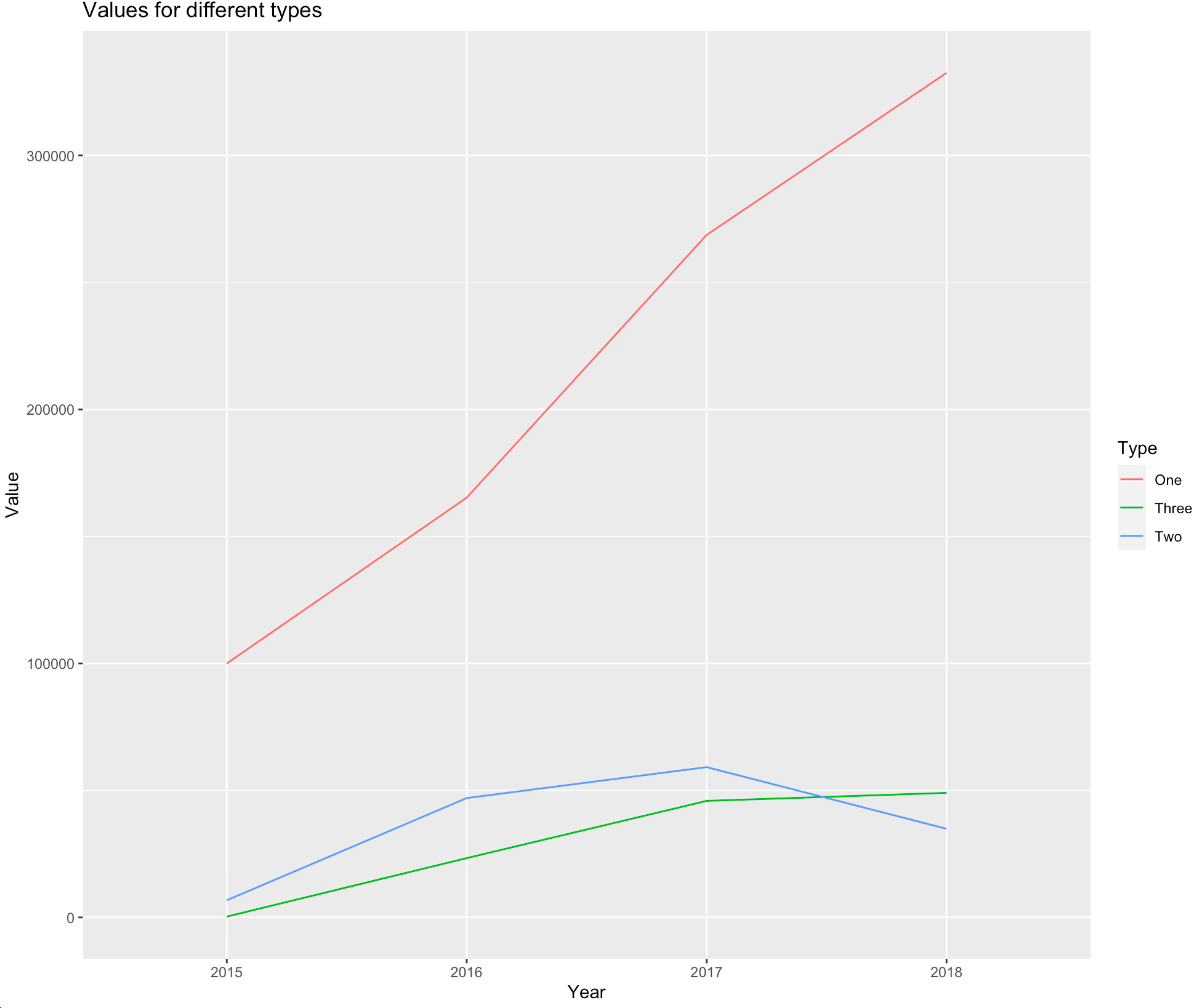 How can I use ggplot to make a multiple line graph, with each column that has year as the x-axis, and each Type as a new line, as the y axis? Thanks!