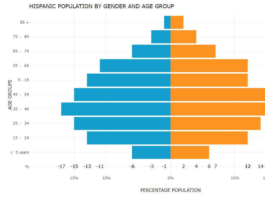 ggtitle("HISPANIC POPULATION BY GENDER AND AGE GROUP") +