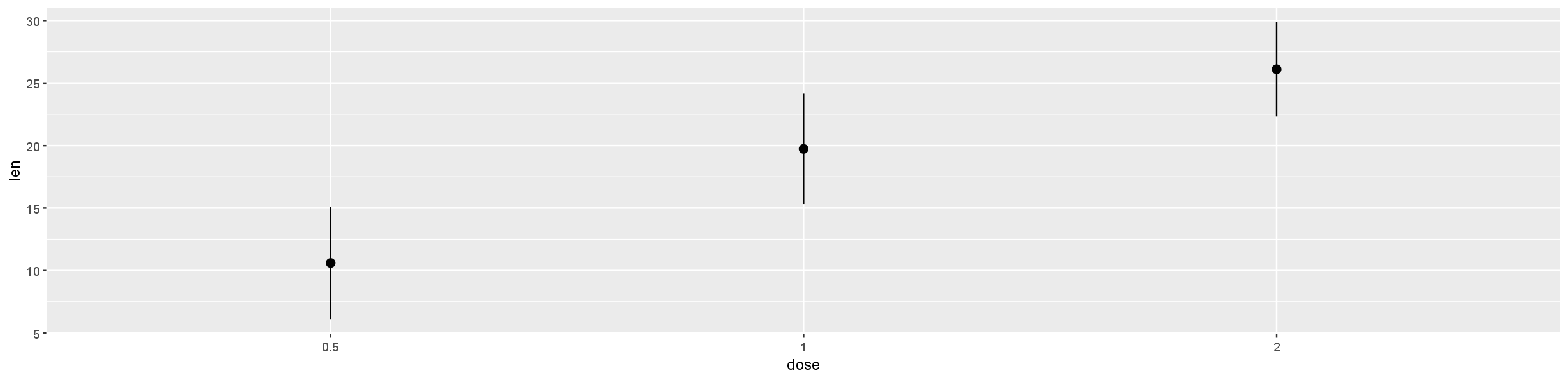 aes(x = dose, y = len, ymin = len-sd, ymax = len+sd)