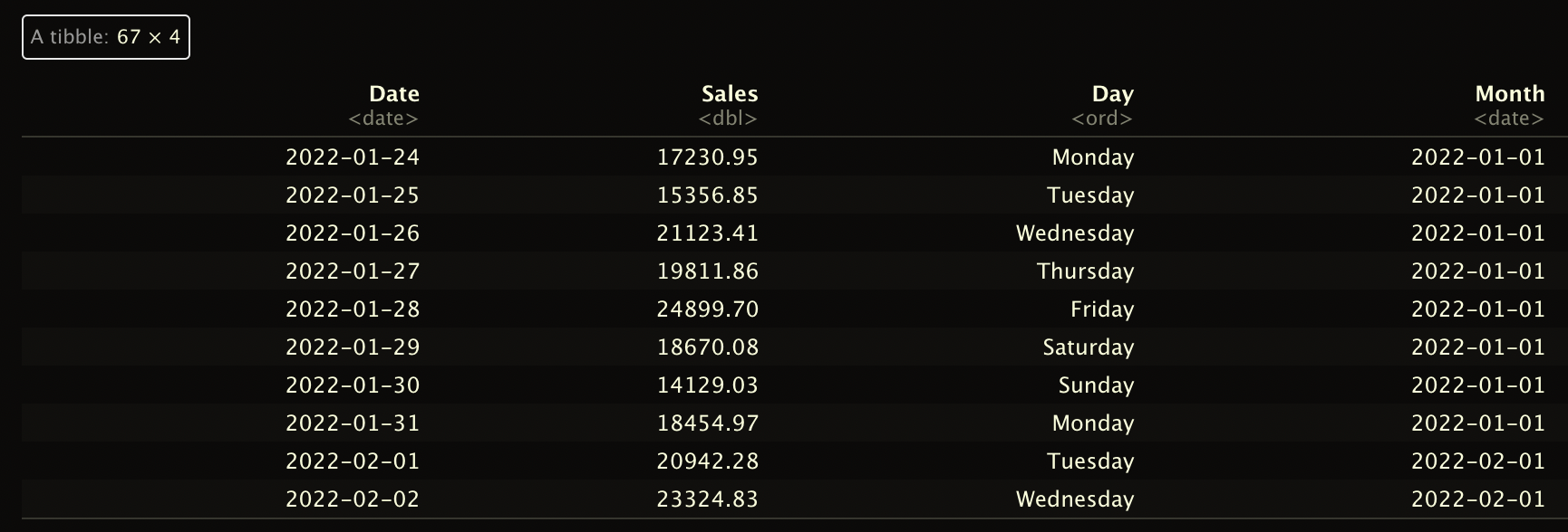 I originally had the Date and Sales columns. By using these lines of code I was able to get the Day and Month columns.