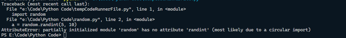 BTW, this is what the circular import warning is about. You are importing random, which is the file name. So, it imports the file you wrote. Whenever it imports the file, import random is executed, which imports the file you wrote…