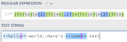 This checks for a string between a pair of double asterisks. It contains a lookahead and lookbehind regex to ensure that it is only 2 asterisks and not more. For example, *** text *** will not match