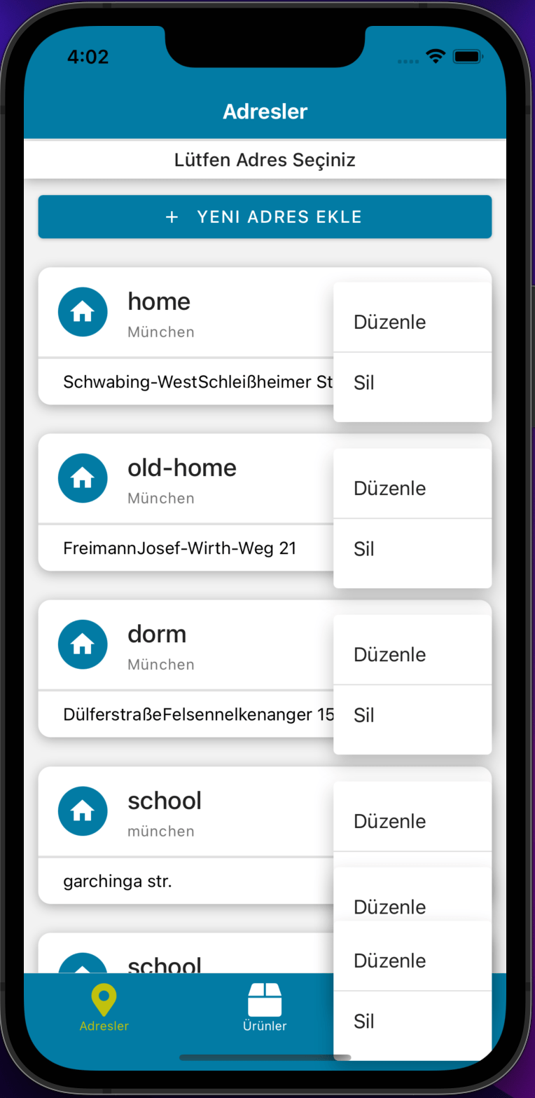 <Button style={styles.addButton} icon="plus" mode="contained" onPress={() => {navigation.navigate("Yeni Adres", {