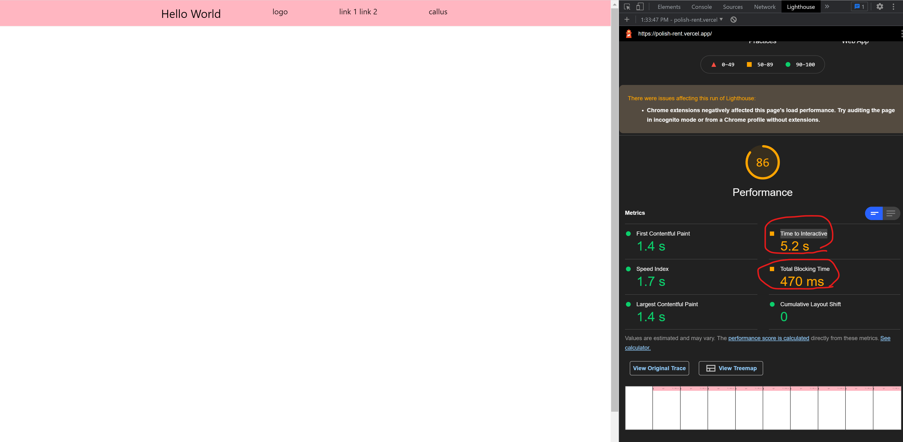 But the performance in lighthouse: Time to interactive – TTL and Total blocking time – TBT are already marked as an issue.