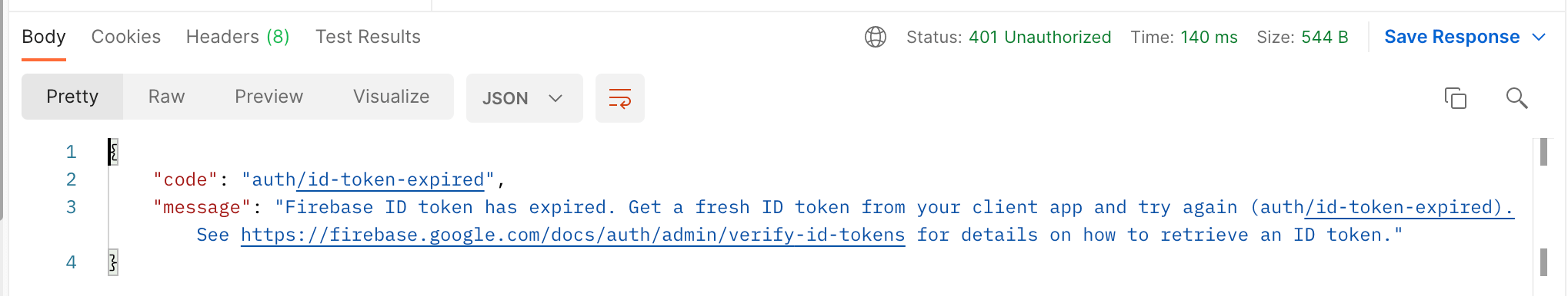 My API returned 401 error while the user token expired or was not valid and it’s returning status code 401 and payload with the error message and code like below.