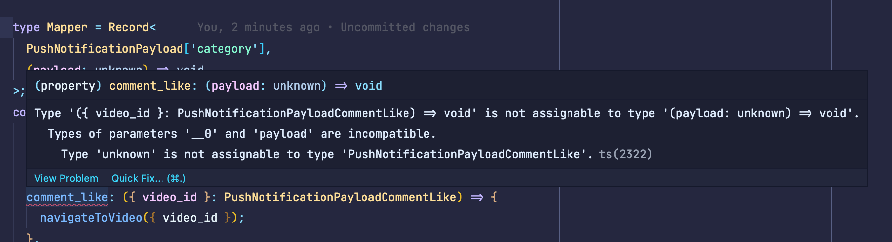 PushNotificationPayloadVideoComment is part of PushNotificationPayload union type, but the TS compiler detects that it’s not assignable to its union