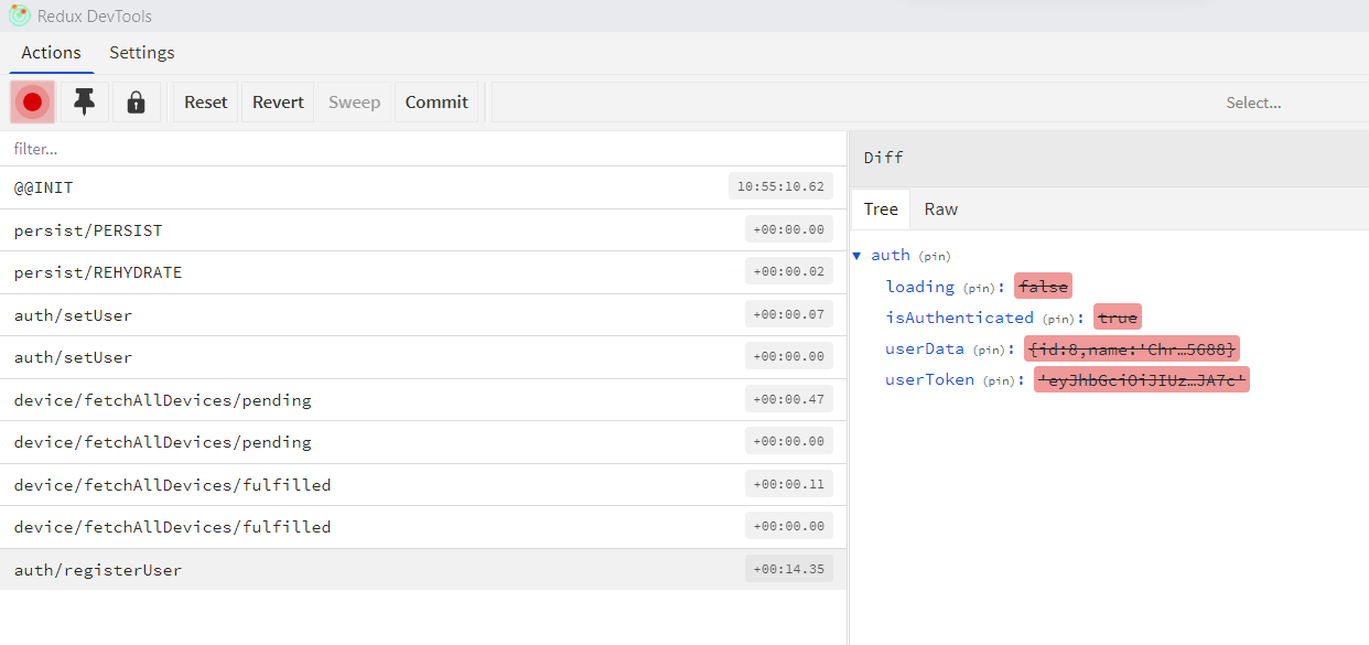 I am developing a react application and using redux toolkit for state management. I have a user logged in with JWT store in the local storage and the details of the user are stored in state.auth. This user can create other users using a form. After filling the form details, when the form is submitted, userRegister() action from the authSlice is dispatched.