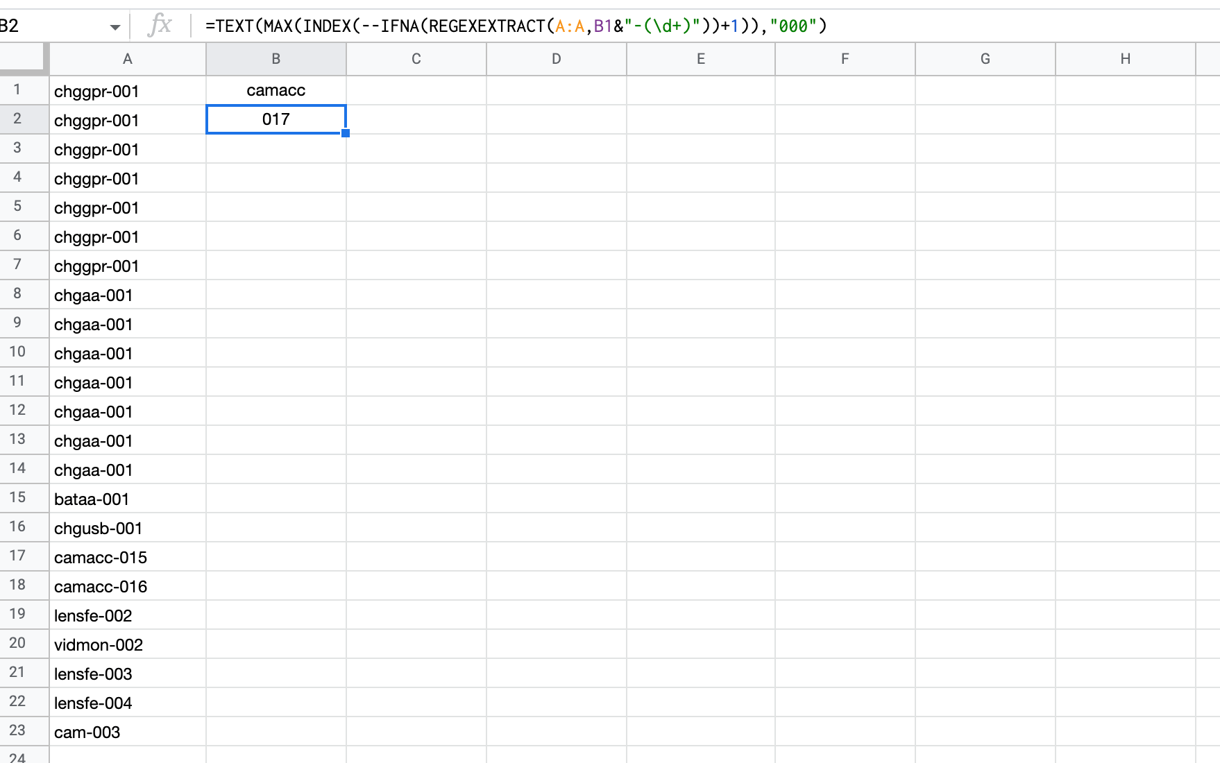 I need to find the latest internal code in a long google sheet, so i know the next number to use in a equipment database… Im new to Regex.