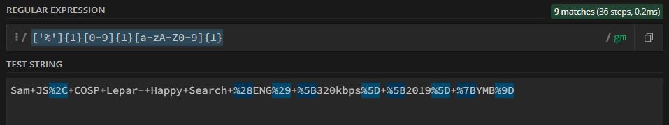 Using Regex, I need to find a word within a encoded url query string which matches start with specific char % and word must be 3 chars length long including starting specific char %.