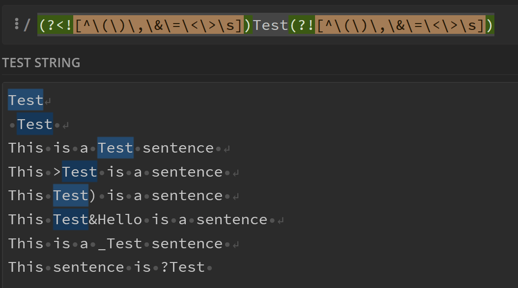 (?<![^\(\)\,\&\=\<\>\s])Test(?![^\(\)\,\&\=\<\>\s])