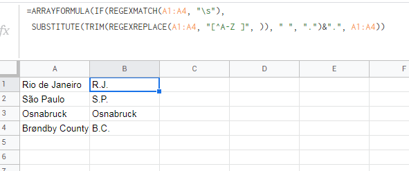 SUBSTITUTE(TRIM(REGEXREPLACE(A1:A4, "[^A-Z ]", )), " ", ".")&".", A1:A4))