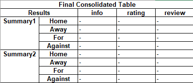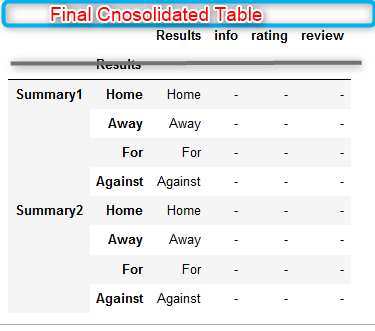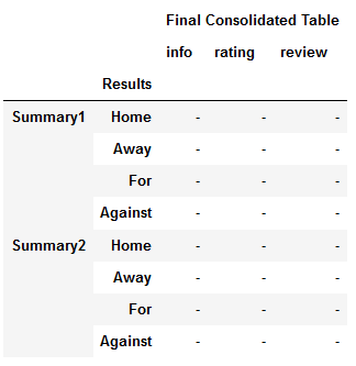 What I want to achieve in the end is a df like below with a header column & I would do that with resultsTable.columns =pd.MultiIndex.from_product([[f'Final Consolidated Table'], resultsTable.columns]). But before that I need to sort the issue I have currently.