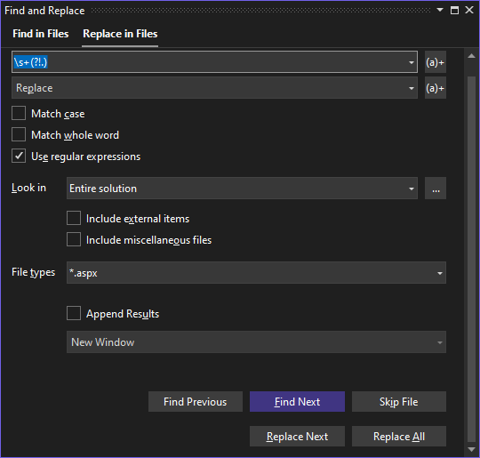 I am trying to remove trailing whitespace including \r and \n at the end of aspx files by using Find and Replace using the pattern