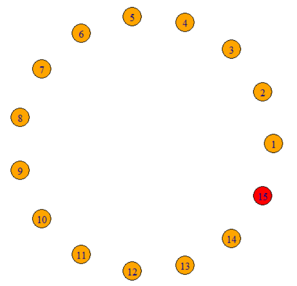 V(graph)$color <- ifelse(data$d == relations$from[1], "red", "orange")