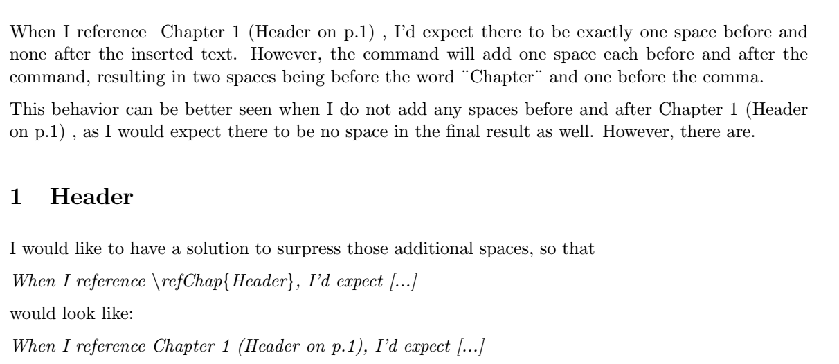 When I reference \refChap{Header}, I'd expect there to be exactly one space before and none after the inserted text. However, the command will add one space each before and after the command, resulting in two spaces being before the word \"{}Chapter\"{} and one before the comma.