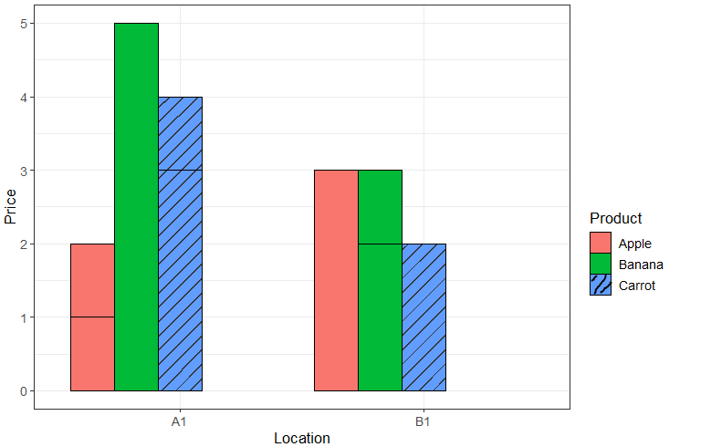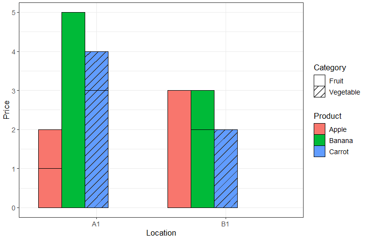 ggplot(ex, aes(x = Location, y=Price, fill = Product, pattern = Category)) +