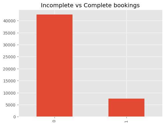 df['booking_complete'].value_counts().plot(kind='bar', title='Incomplete vs Complete bookings')