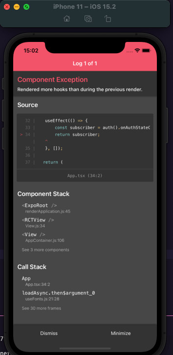 I’m working on a project with bare expo and react native. I have implemented firebase to my project. The signIn and register are working fine. I have created a auth check to send the user to another page in case he is logged in. Although I am receiving the following error when attempting to send the user to another page: