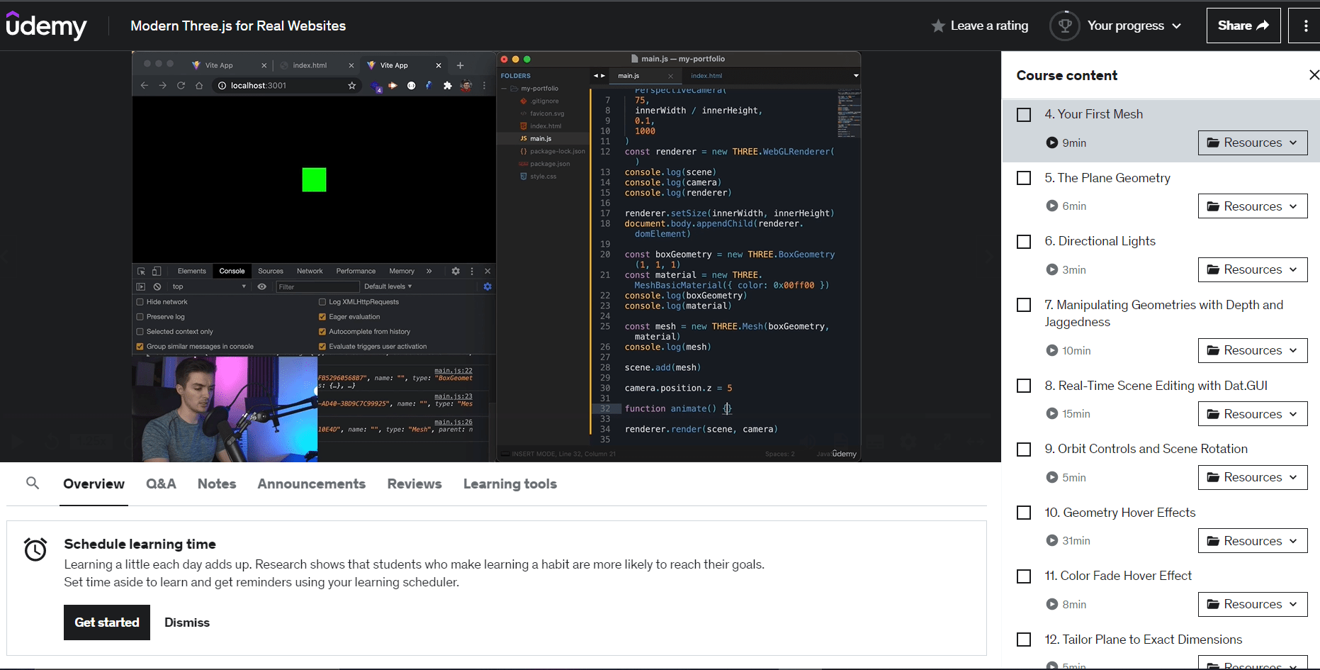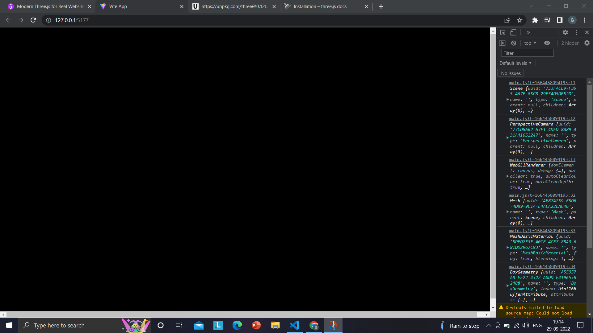 I just started out with three.js(and do not know much about it), was following a tutorial according to which a green box should appear on the screen. I’m not having any errors in the console. I’m just having an empty black screen