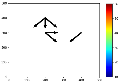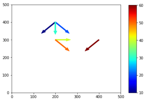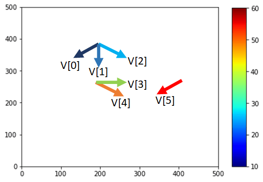 I am plotting 6 arrows at specific coordinates. How do I render colors to these arrows based on the array V? The values are to be assigned according to the expected output.