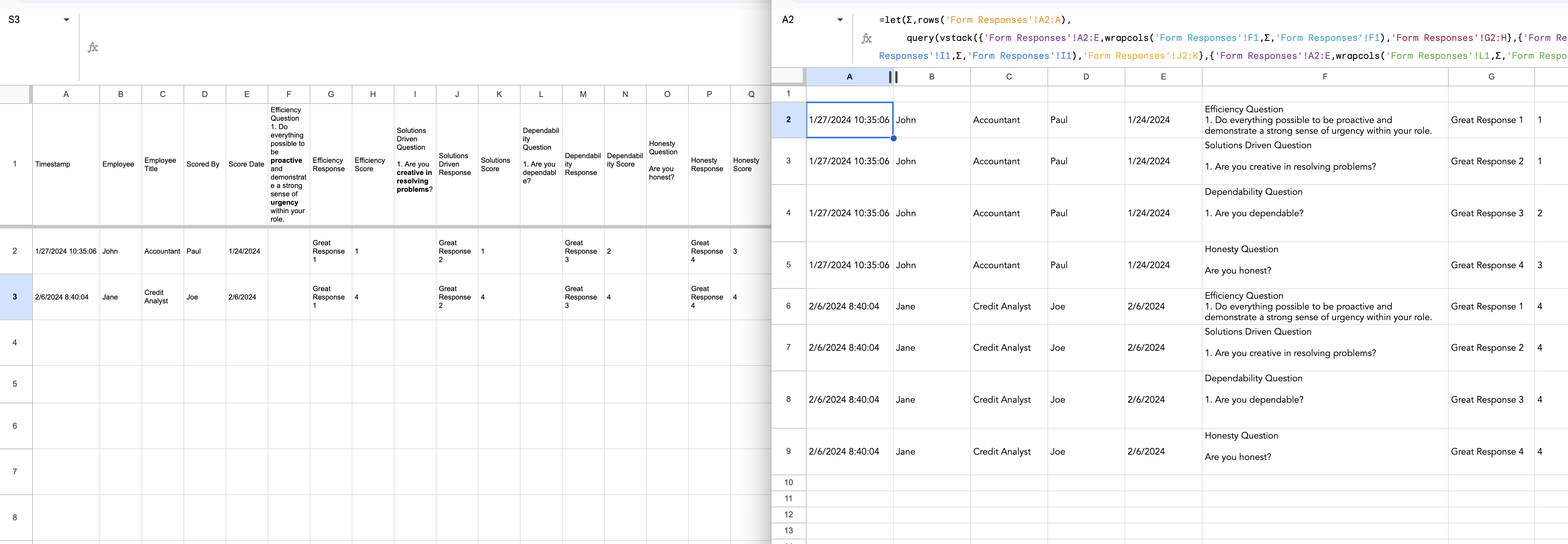 I have a google form setup to receive submissions into a google sheet. The data that comes through is in wide form, I am attempting to get it in long form.