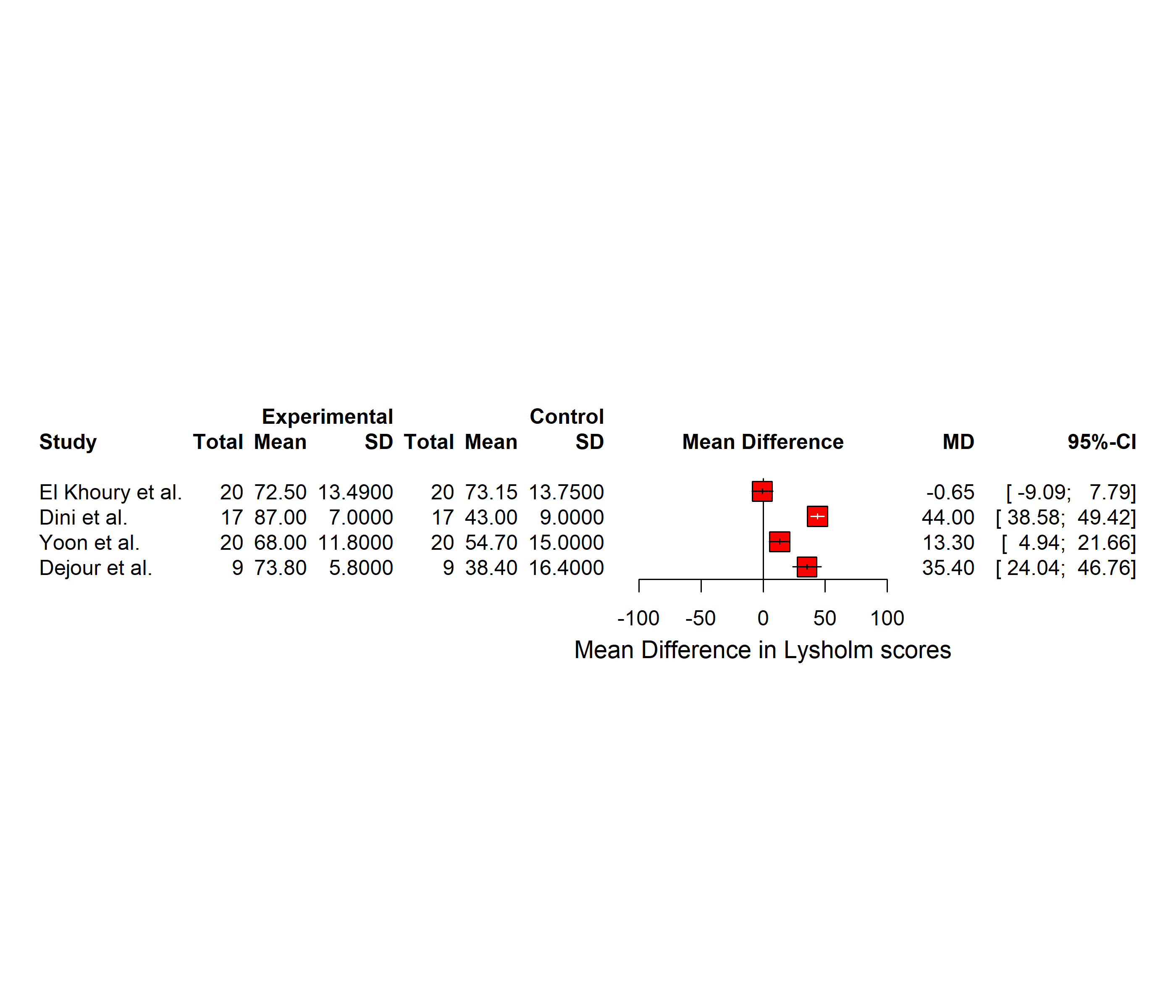 forest(MD_LYSHOLM,fixed = FALSE, random = TRUE, overall= FALSE, col.random = "blue", prediction = TRUE, pooled.events = TRUE, xlab = "Mean Difference in Lysholm Scores",fs.xlab = 14,weight.study = "random", col.study = "black", col.square = "red",col.square.lines = "black", col.diamond = "black",hetstat = TRUE, overall.hetstat = FALSE, hetlab = "Heterogeneity",resid.hetstat = FALSE, print.I2 = TRUE, print.tau = TRUE)