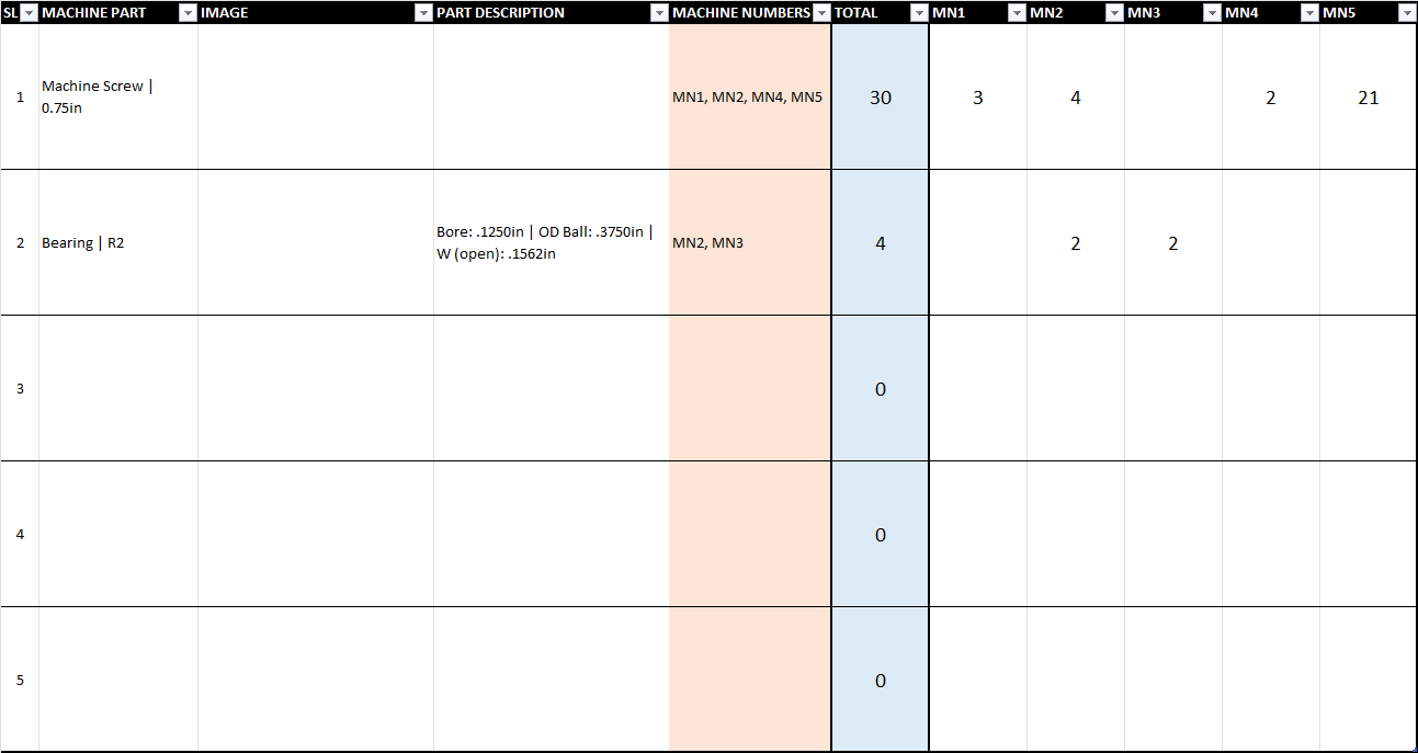 I have an excel table where I calculate the total number of machine parts required in a large-scale manufacturing operation. Each row represent a different machine parts and each column after some description of the machine part represents a machine number. The same machine part may or may not be used in multiple machine numbers. I have a "Machine Numbers" column where I would like to return all the Column Names where a value is present. As in, if that machine part is required in the Machine Numbers MN1, MN3 and MN10, it should return "MN1, MN3, MN10". I have posted the table image below for further clarification with some example answers on the red column: