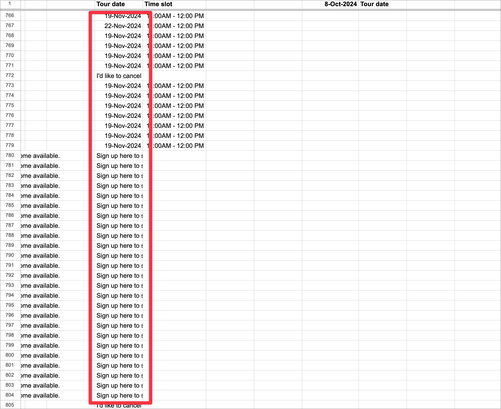 I have a spreadsheet connected to a form for families to sign up for tours of a school, and I can’t get two (probably 3) of my tabs to return any data, aside from the header row.