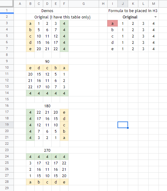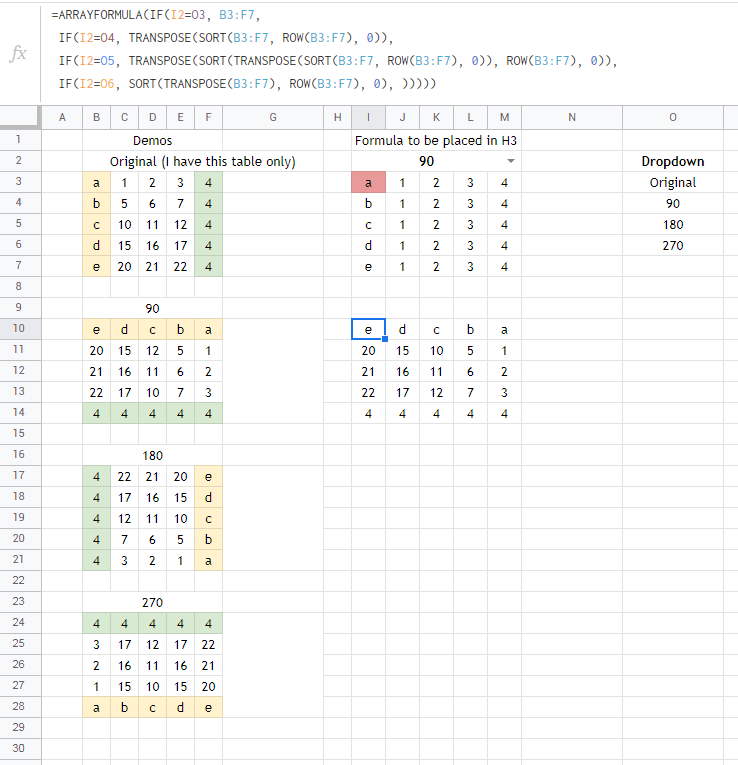 I want to Rotate the original table using the input from the drop down I2:M2 to get the result like 90, 180, 270 Rotation.