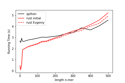 [Times to count for different n-mer lengths (Python black, rust red)][1]