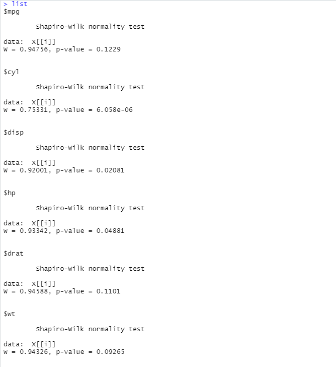 list= lapply(mtcars, shapiro.test)
