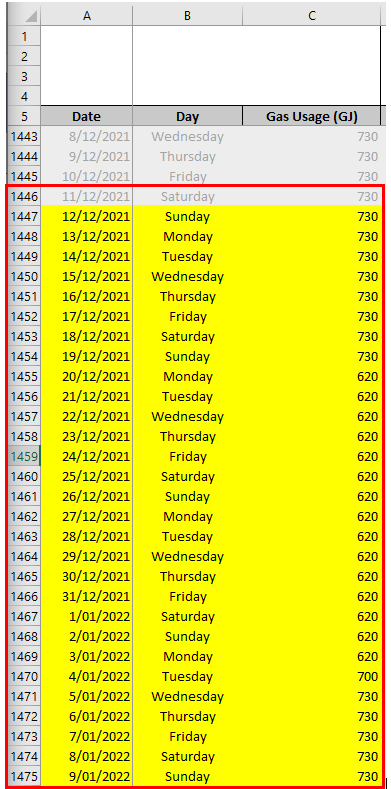 I am trying to create VBA code that will select the Date, Day and Gas Usage columns (as depicted below) for the current day and the following ten days (TODAY()+10) (as highlighted in red by the below picture). Where this range can be copied and exported into a new csv file.