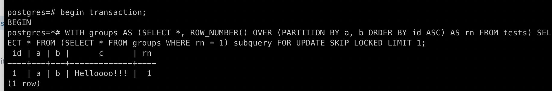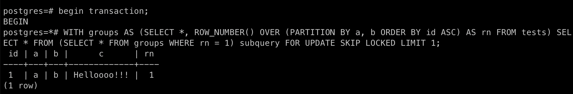 Each process needs to retrieve the first row in a group (group by columns "a" and "b") from the table "tests" to perform some computations over it but one process shouldn’t be able to select the row that has been already captured by another process. For example: