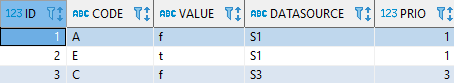12 SELECT 2 id, 'E' code, 't' VALUE, 'S1' datasource, 1 prio FROM DUAL),