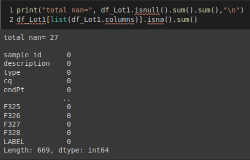 As you can see there are only few lines but I would like to see everything (669 in total) where I would be able to see each line individually to see how many nan values there are in total per line (such that I find the 27 along the dataframe).