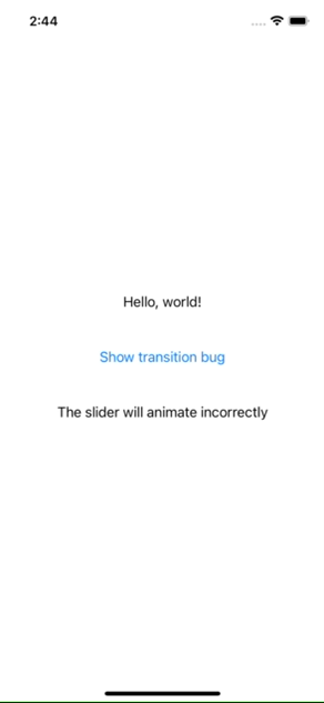 I have this strange animation bug I’ve not been able to figure out. When transitioning on a view that contains a slider, the slider appears to animate independently of the rest of the view.