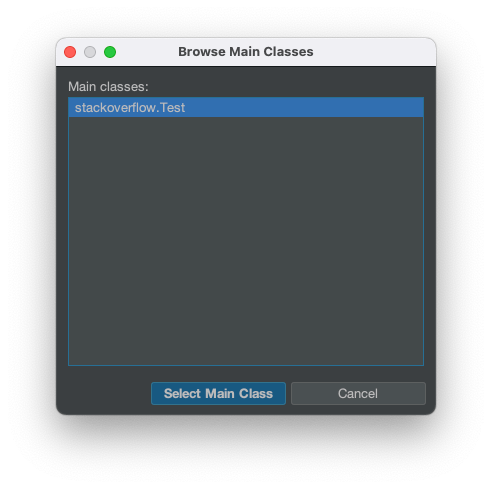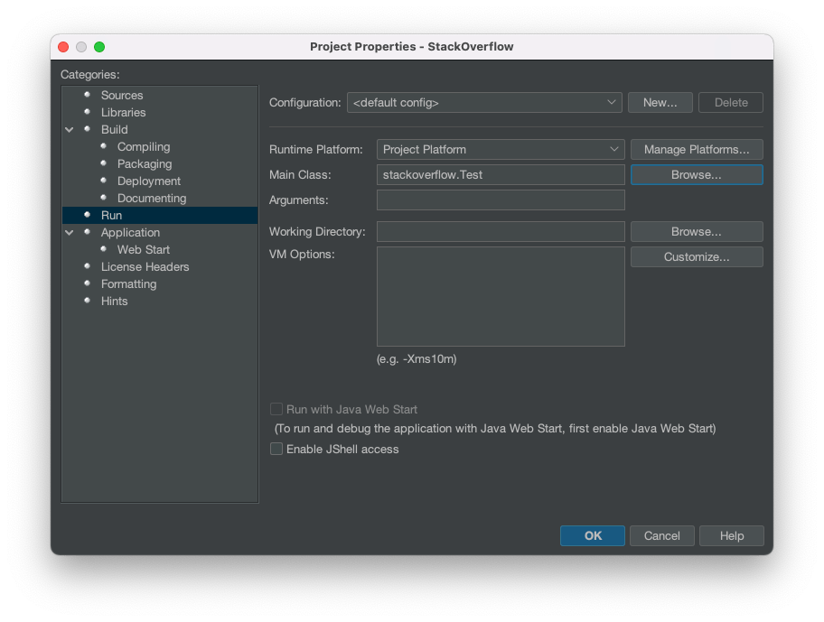 Navigate to "Build" > "Run" and verify the "Main Class" property
