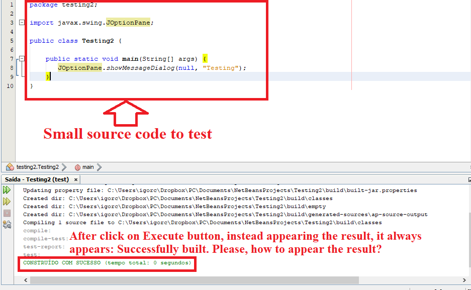 When creating any source code, as in the example below, and after clicking the button to execute, the result of the code execution does not appear, and instead always appears the phrase: "Built Successfully".