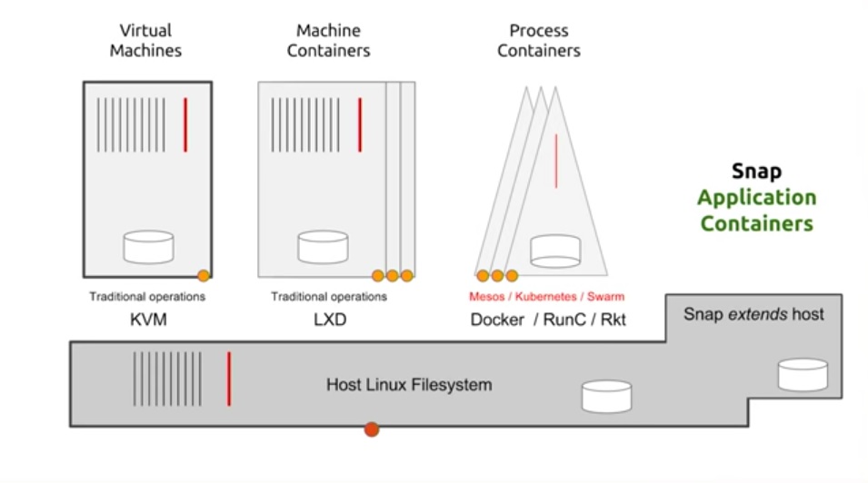 Do Snap fit between VM and Linux Containers, in the sense that it not only share the kernel but even more of the host system, without being a totally different installed OS using hypervisor?