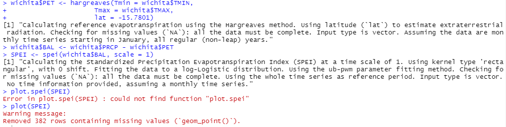 I’m trying to implement SPI and SPEI calculation index using SPEI package, but the function plot.spei() could not be found, like below.
