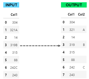 df = pd.DataFrame({'Col1': ['304', '321A', '14', '319B', '315', '88', '242C', '243']})