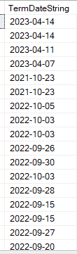 The following SQL query works and returns all data correctly, where TermDateString is never null and appears to be always formatted correctly: