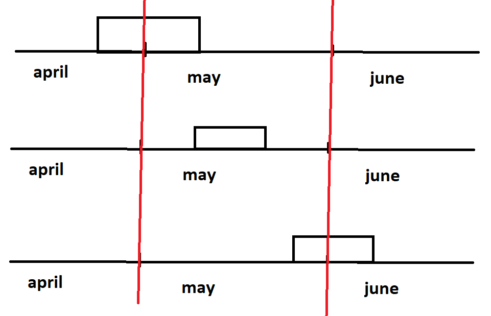 My problem is that I want to sum periods of date from only may, but as you can see below some of events starts before first day of may and some end after last may day.