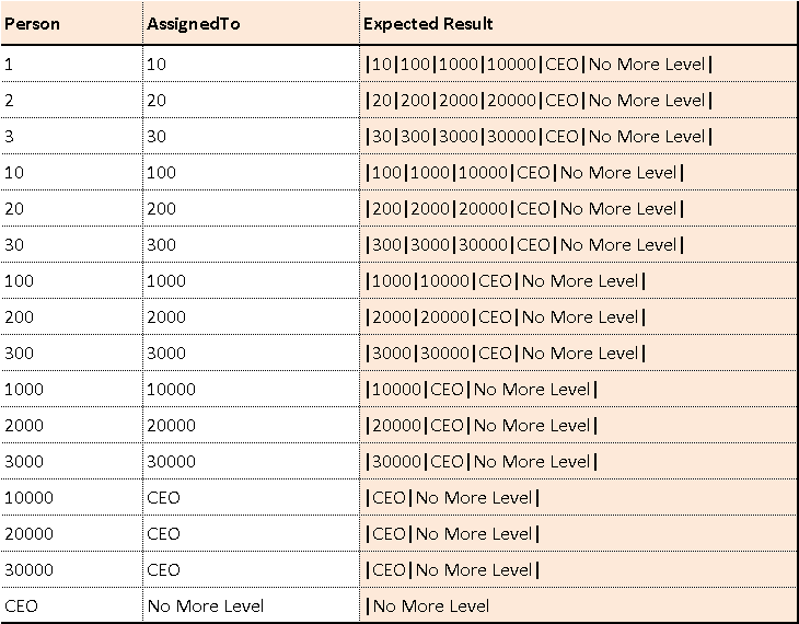 so for person 1 the complete reporting structure shoule be |10|100|1000|10000|CEO|No More Level|