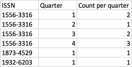 For instance in this Image, I would like to group by quarter only within a particular ISSN. https://i.stack.imgur.com/1QUIk.png
